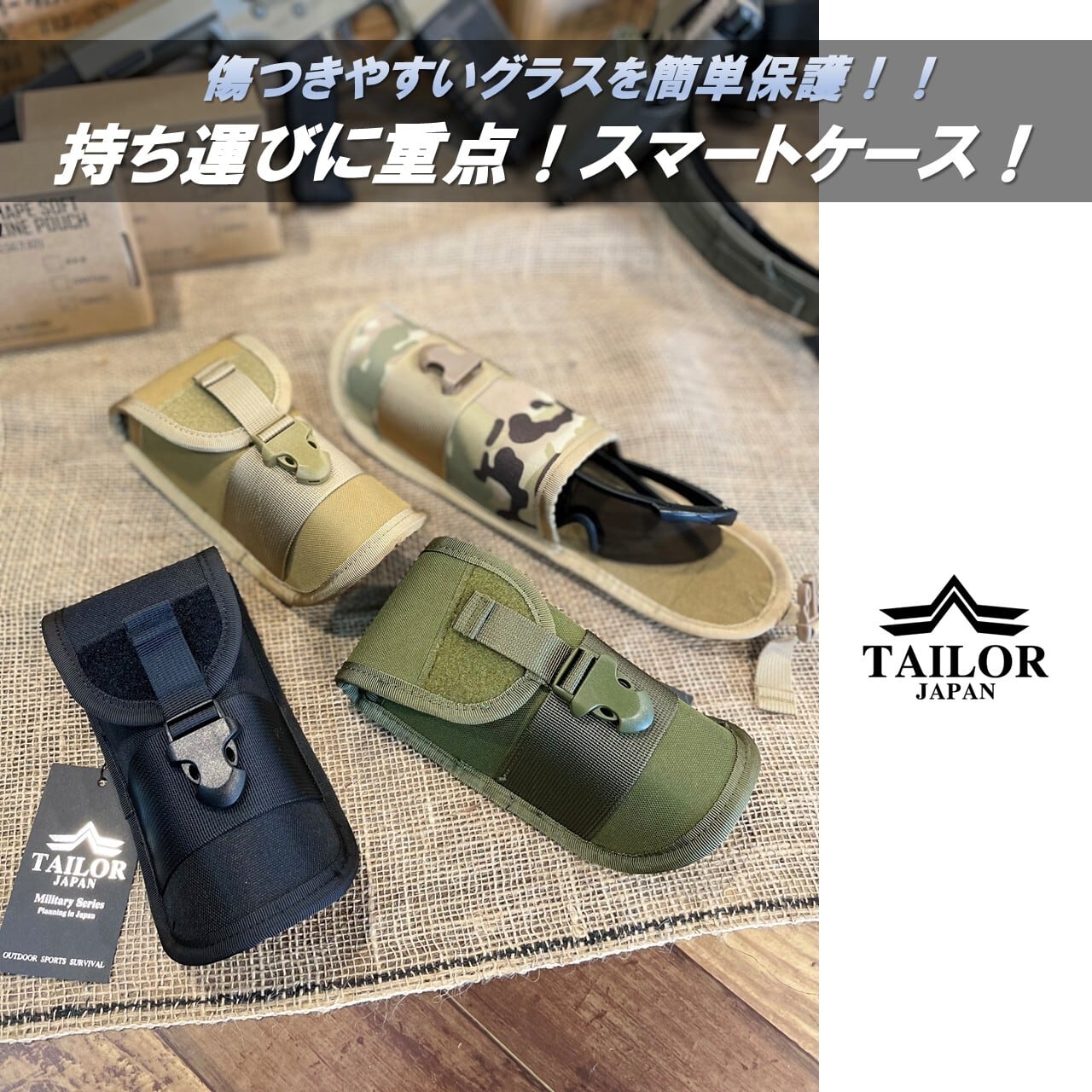 【耐衝撃・多用途】TAILOR JAPAN製 ハードシェル シューティンググラスケース ミリタリースタイルと実用性を融合した、TAILOR JAPANの多機能グラスケース。ハードな使用にも耐える高耐久ナイロン素材と、衝撃や汚れからしっかり保護する設計で、シューティンググラスやサングラス、眼鏡の収納に最適。モールモジュラーで装備に直接装着可能でサバゲー・キャンプ・アウトドアでも大活躍。