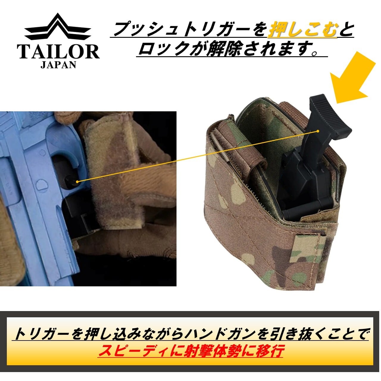 ・ベルクロ調整による固定式で、グロック、ガバメントシリーズ、リボルバーなどほとんどのハンドガンを収納可能です。
