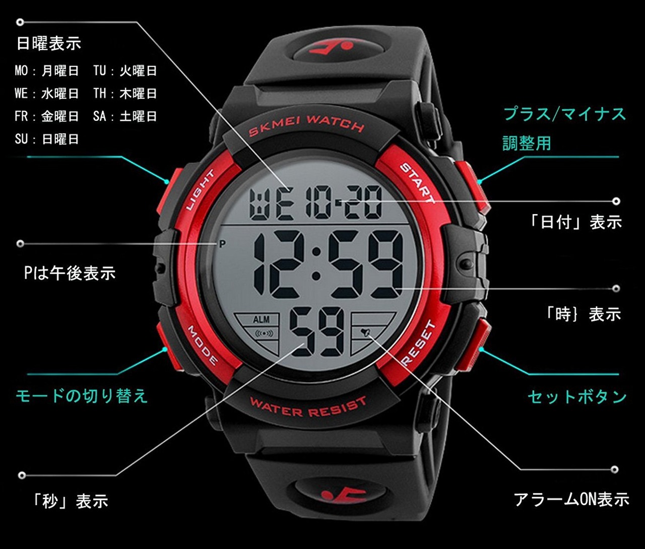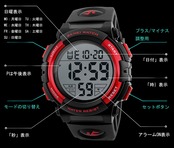 機能:アラーム・ストップウォッチ・防水設計・12/24・日付曜日表示