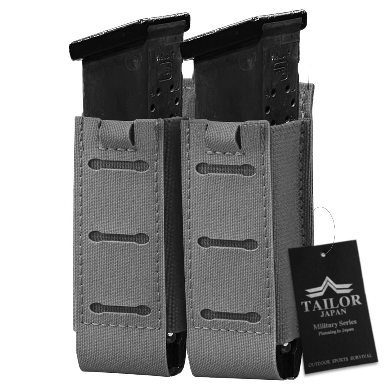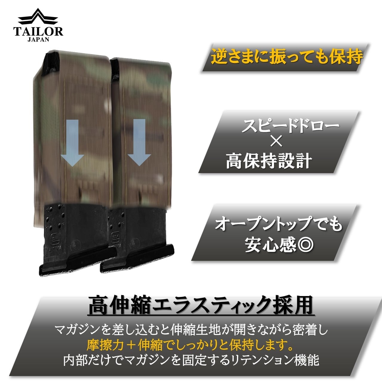 【エラスティック素材による高いホールド力】ポーチ側面には高伸縮エラスティック生地を採用。この素材がマガジンに自然なテンションをかけることで・マガジンサイズに合わせてフィット・走行時や移動時のズレ防止・逆さにしても落ちにくい保持力を実現しています。また硬いインサートを使用していないため、様々なサイズのマガジンに柔軟に対応できる構造となっています。