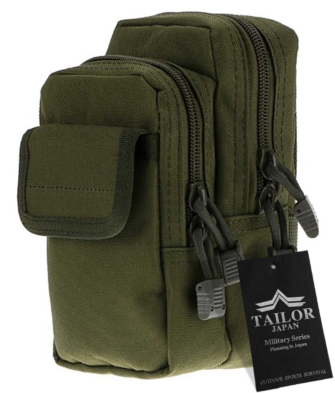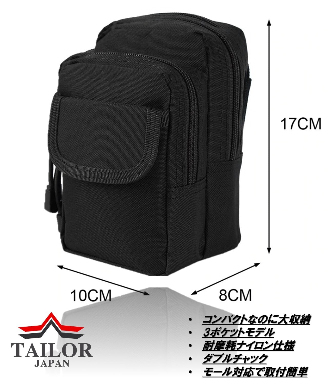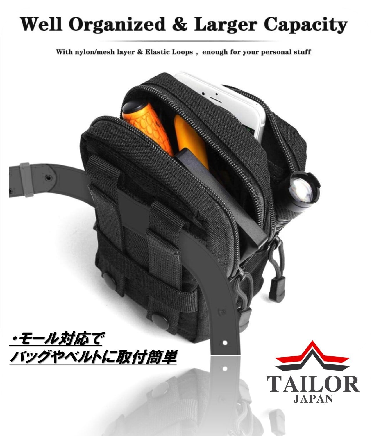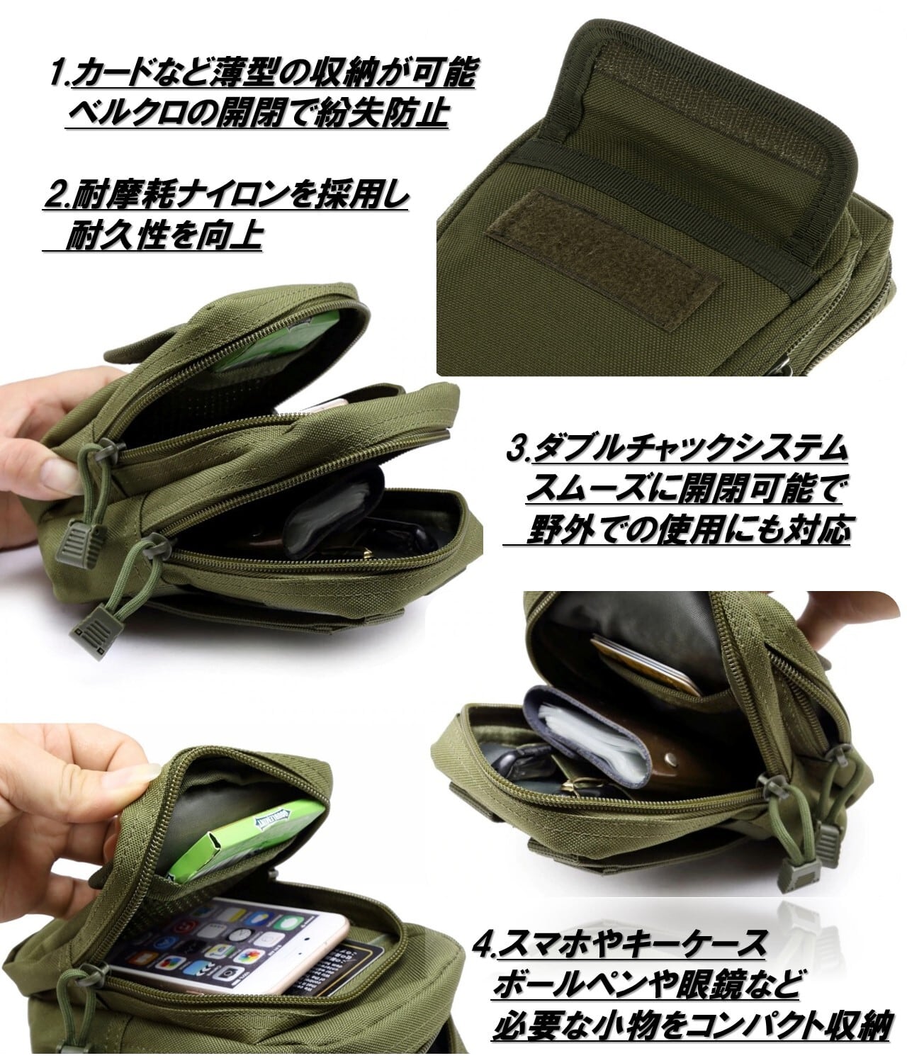 【仕様②】大口のチャックは中身が見えやすく取り出しやすい。ダブルファスナーで左右どちらからでも開閉できます。モール対応なのでお使いのバッグやベルトに装着可能。