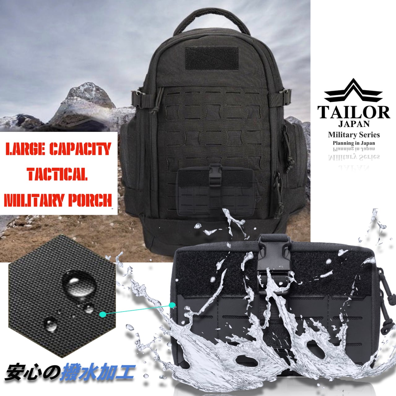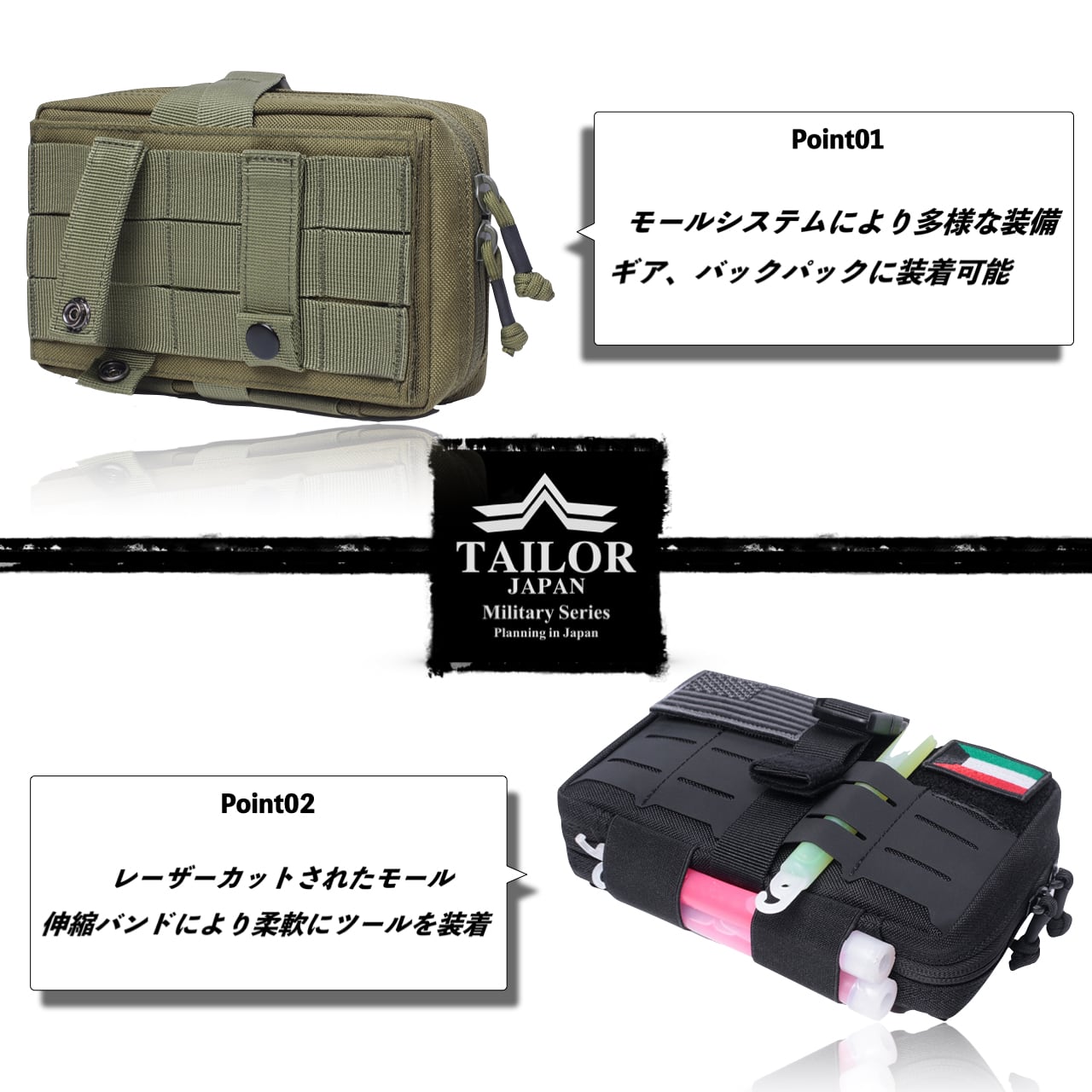 モールシステムの着脱式を採用することにより、バックパックやベルト等の取り付けはもちろん、スマートなポーチとしても活用することが出来き、多様な日常シーンでご活用いただけます。